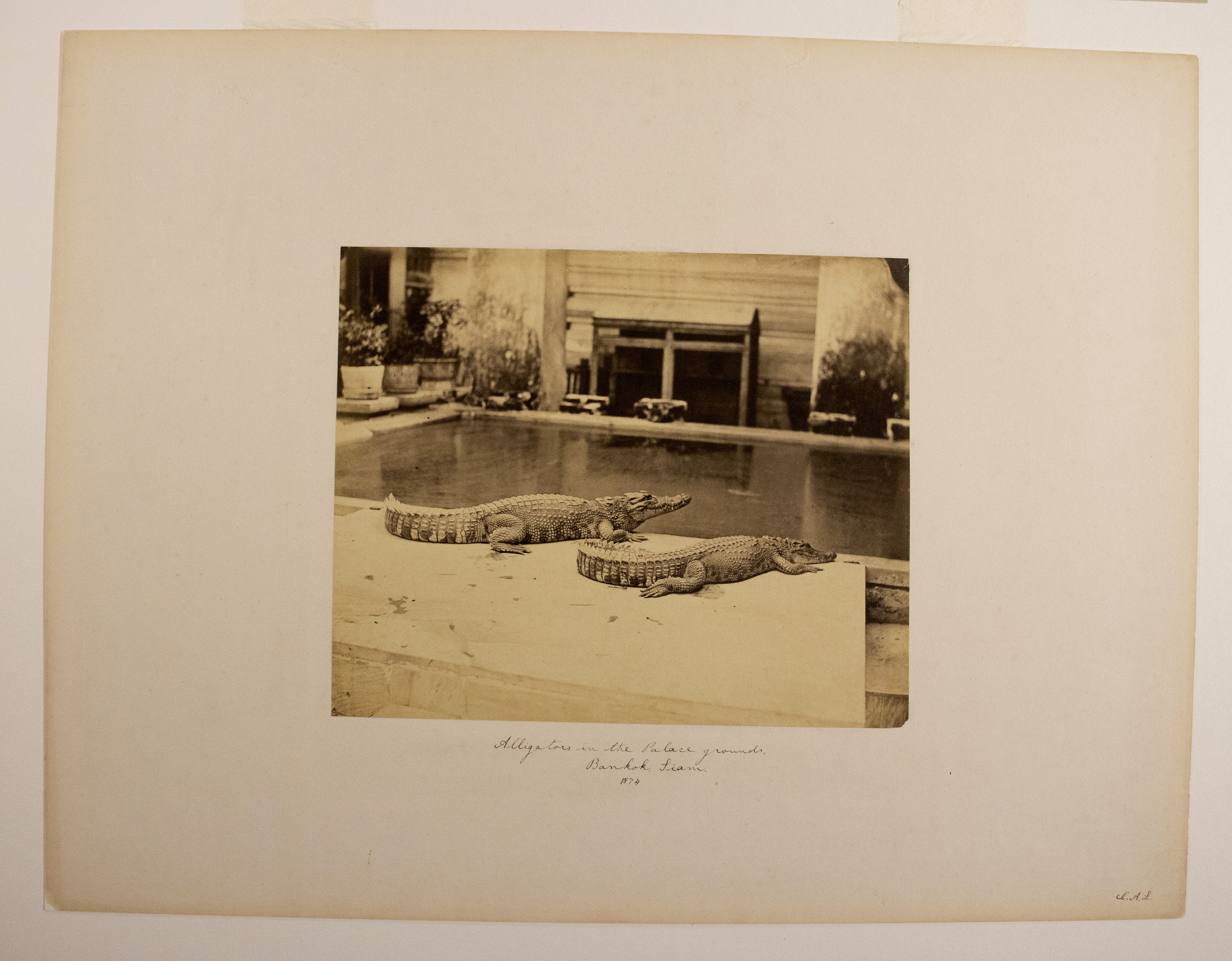 Two alligators lie on the edge of a manmade rectangular pool of water. Three potted plants in the background. | Inscription: "Alligators in the Palace grounds, / Bankok, Siam. / 1874 / C.A.L." on front in ink in cursive by Charles Longfellow. | Dates and notes: 1874 as given in inscription.