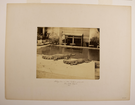 Sepia photograph with an inscription representing two alligators lying down by a manmade pool filled with water, plants in pots and a wall in the background.