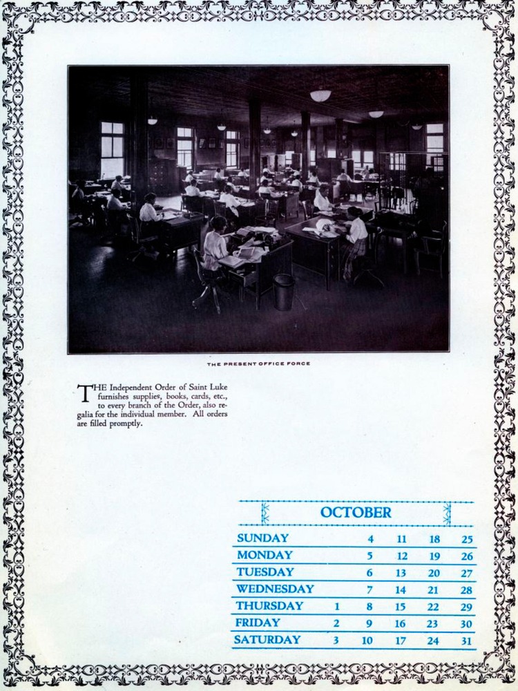 Page with decorative border contains monthly calendar printed in blue ink in vertical format. This image, captioned "The Present Office Force," depicts the combined office staff of all St. Luke departments working on the well-lit fourth floor of the home office building.