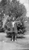 Maggie Laura Walker posing in front of tree. Possibly Camp Atwater in Massachusetts.