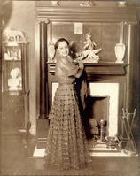 Maggie Laura Walker, standing in front of fireplace in the parlor of her family home at 110 1/2 E. Leigh Street in Richmond, Virginia. The photo was taken on the eve of her departure for Bermuda in 1937 or 1938. She wears a floor-length dress with sheer sleeves. Her skirt is full with many horizontal tiers of ribbons. She is holding a lightweight wrap, perhaps, and clasps the fireplace mantel. In the cabinet behind her is a bust of Maggie Lena Walker.