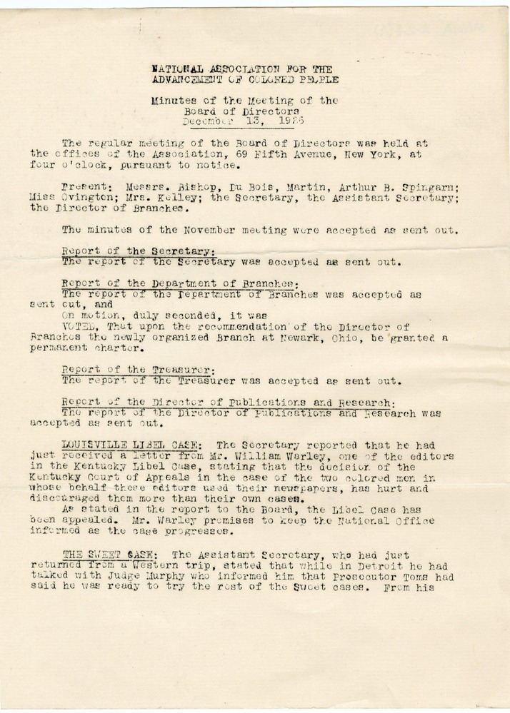 National Association for the Advancement of Colored People - Minutes for the Board of Directors Meeting held on December 13, 1926