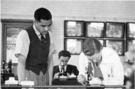 Group of three people in science classroom or laboratory at University of Michigan Medical School