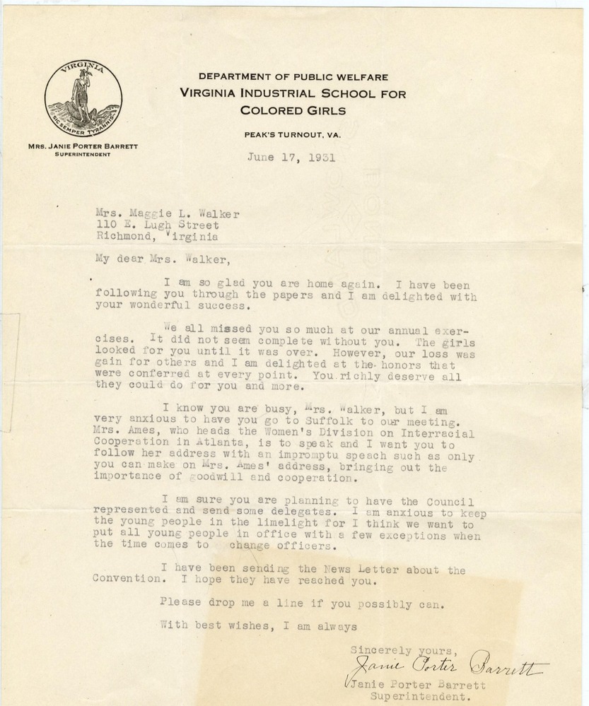 Virginia Industrial School for Colored Girls - letter from Janie Porter Barrett to Maggie L. Walker