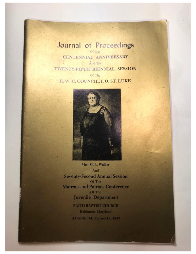Journal of Proceedings of the Centennial Anniversary and the Twenty-Fifth Biennial Session of the R. W. G. Council, I. O. St. Luke And Seventy-Second Annual Session of the Matrons and Patrons Conference of the Juvenile Department, Faith Baptist Church, Baltimore, Maryland, August 14, 15, 16, 1967. / Contained are pictures of officers and trustees as well as lists of officers, trustees and staff members. Some committees are pictured. A brief history of one hundred years of operation follows. The Matrons and Patrons conference program is followed by the full convention program including a pageant depicting 100 years of the Order's history. Convention proceedings follow with details of the Order's memorial service. Of note was a decision to move funds earmarked for commissions to encouraging growth and development. The order continues to publish a newsletter, The Fraternal Monitor, although subordinate councils are less involved in fraternal and ritual endeavors. Financial reports follow as well as an especially interesting analysis of the social and economic conditions of Negroes at this time from the medical examiner.