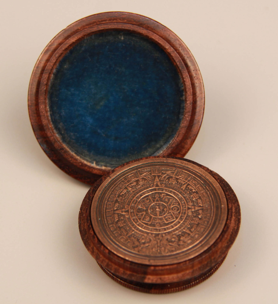 Bronze, wood. Medal: Dia 4, H 0.5 cm. Case: Dia 5.3, H 4.5 cm