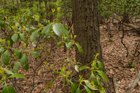 New spring growth on mountain laurel ; Kalmia latifolia; in the Chestnut Oak / Mountain Laurel Forest at Rock Creek Park.Photographer: Sam Sheline, courtesy of NatureServeShared under Creative Commons BY; Chestnut Oak / Mountain Laurel Forest on White Horse Trail;
