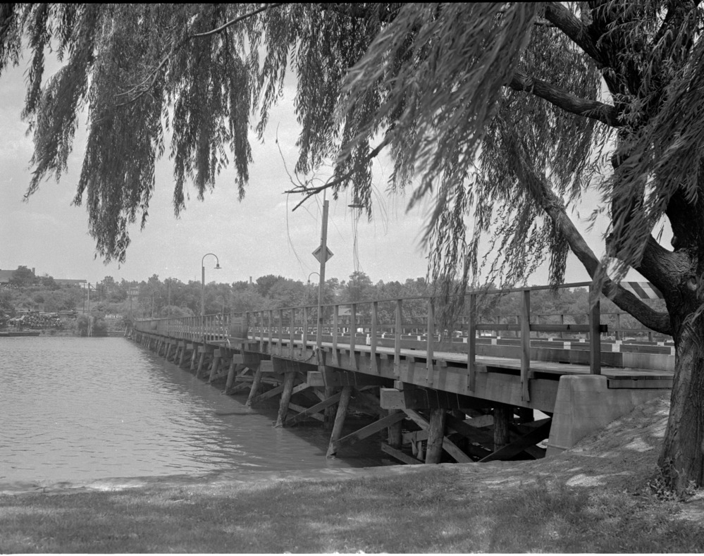 An unknown bridge, possibly one of the 14th Street bridges, spans the Potomac between Washington D.C. and Arlington, VA during World War II.