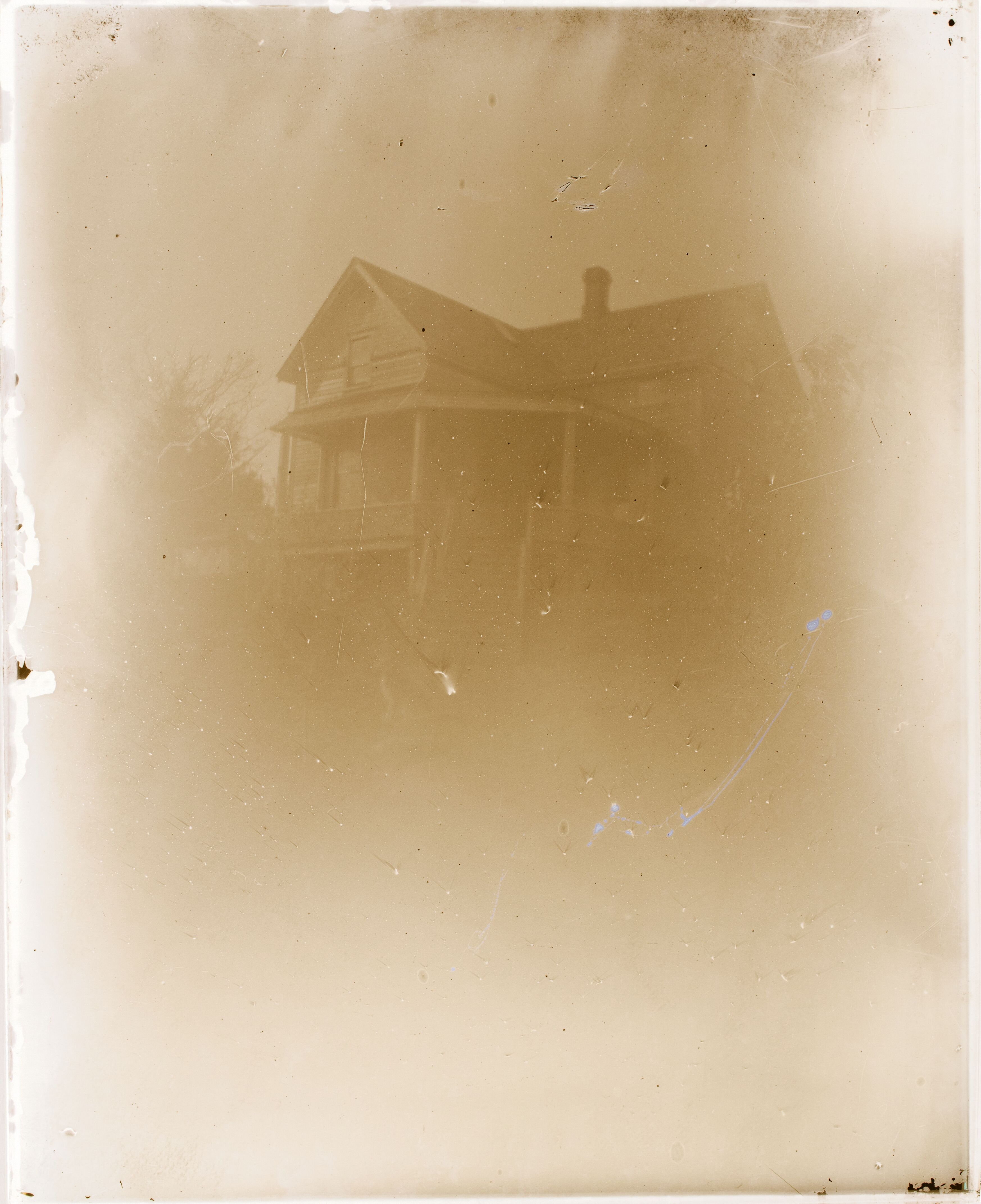 Unidentified house. Poor image quality is due to degradation of the photographic emulsion, including pulling away from the glass plate. Davis Family Collection, Series II: Photographs, Subseries C: Glass Plate Negatives, File 041.