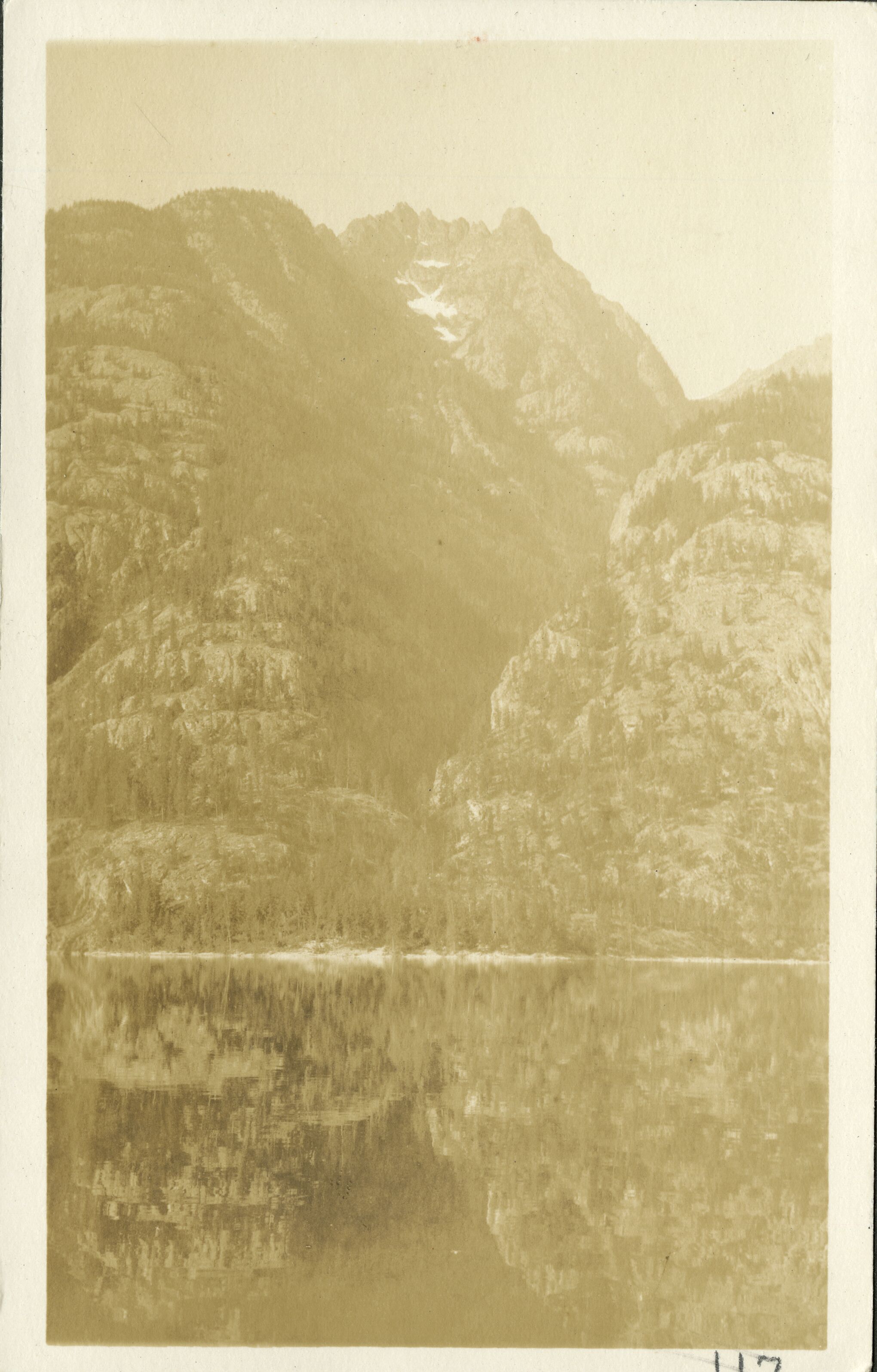 Photo 102 of an album of photographs taken by L.D. Lindsley of Mary Roberts Rinehart and party visiting the North Cascades in 1916. The catalog description reads: "Reflection off lake of a mountain with a cleft canyon." (North Cascades NPS Complex Museum Collection, Assembled Collections, Series II: Stehekin Area Photographs, File 001 - Mary Roberts Rinehart Album.)