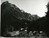 View of Monte Cristo including seven buildings, picnic tables, signs and numerous cars. Monte Cristo Lodge in center. Near Index, Washington. (North Cascades NPS Complex Museum Collection, NOCA.0002 Assembled Collections, Series V: 1963 NPS North Cascades Survey Photographs, Subseries A: Prints and Negatives, File 002)