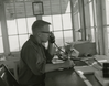 Fire lookout on radio, possibly in the Chumstick Mountain Lookout. (North Cascades NPS Complex Museum Collection, NOCA.0002 Assembled Collections, Series V: 1963 NPS North Cascades Survey Photographs, Subseries A: Prints and Negatives, File 293a)