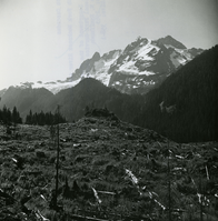 View of Mount Shuksan from clearcut area. (North Cascades NPS Complex Museum Collection, NOCA.0002 Assembled Collections, Series V: 1963 NPS North Cascades Survey Photographs, Subseries A: Prints and Negatives, File 186)
