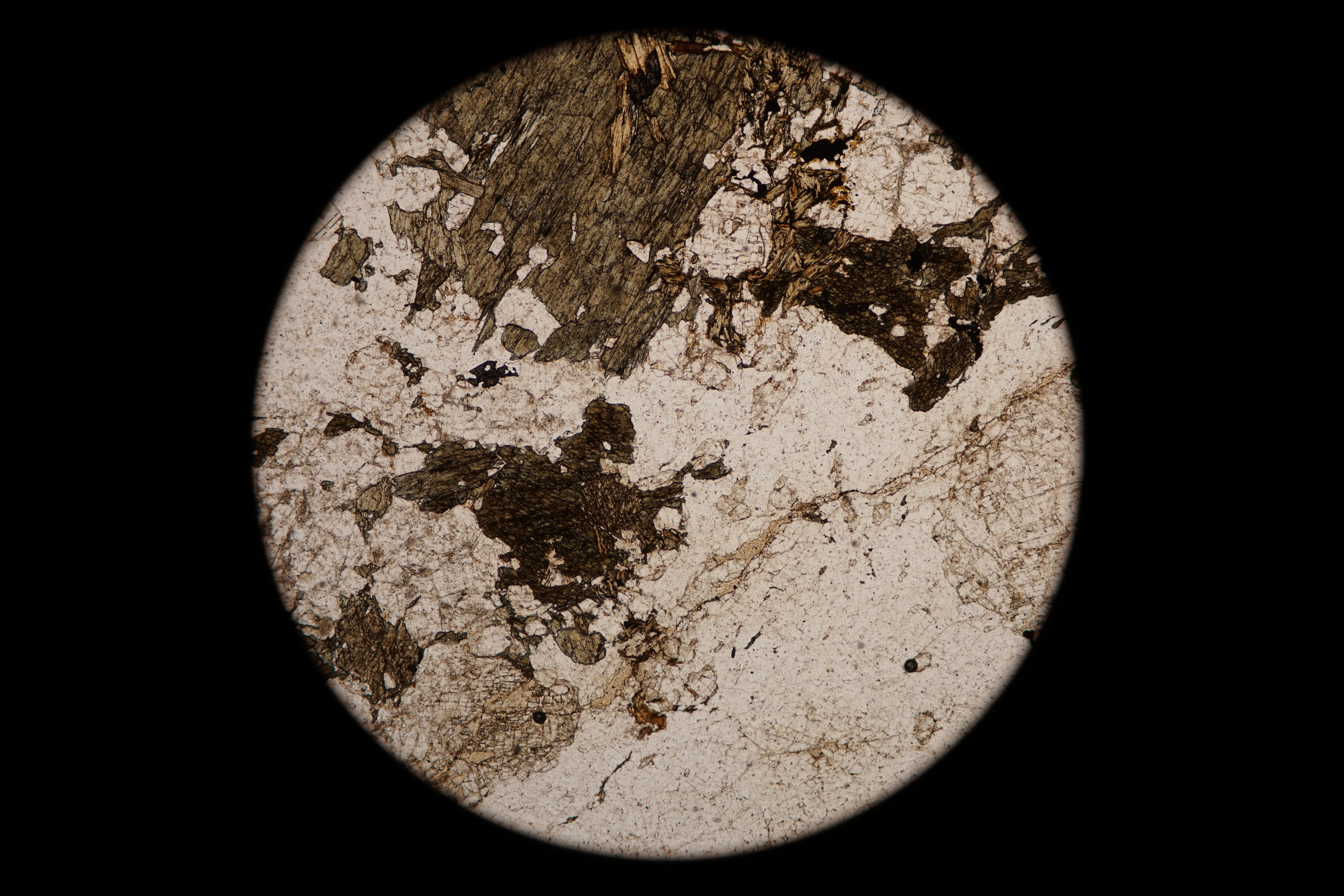 Microscopic image of a thin section of gneiss collected by Peter Misch near Skagit Gorge in 1967. One of four images. (Peter Misch Geology Collection, North Cascades NPS Complex Museum Collection.)