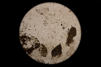 Microscopic image of a thin section of biotite schist collected by Peter Misch in 1967. No location informaton noted. One of sixteen images. (Peter Misch Geology Collection, North Cascades NPS Complex Museum Collection.)