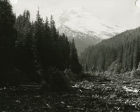 View of Mount Baker from Boulder Creek. (North Cascades NPS Complex Museum Collection, NOCA.0002 Assembled Collections, Series V: 1963 NPS North Cascades Survey Photographs, Subseries A: Prints and Negatives, File 255a)