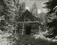 Abandoned cabin on mining claim at road head along Cle Elum River. (North Cascades NPS Complex Museum Collection, NOCA.0002 Assembled Collections, Series V: 1963 NPS North Cascades Survey Photographs, Subseries A: Prints and Negatives, File 242c)