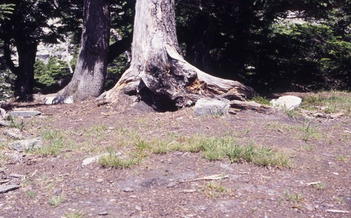 Cascade Pass, Revegetation Site TH4, revegetation monitoring photograph. Text on slide frame reads: "REV/CAS/TH4/b-3, Cascade Pass, #4 Thornburgh camp area to the northeast?, 1995 revisit of Miller revegetation work." (North Cascades NPS Complex Museum Collection, NOCA.0013 Revegetation Program Records, Series XI: Photographs, File 001 - Cascade Pass, Vicinity Impacts and Revegetation Sites, 1970-2004)