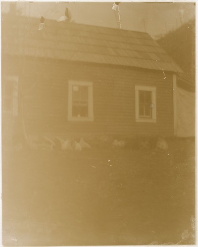 Chickens in front of a cedar shake house. This photograph was most likely taken at the Davis family homestead at Cedar Bar. Blurry image is probably due to degradation of the emulsion in the glass plate. Davis Family Collection, Series II: Photographs, Subseries C: Glass Plate Negatives, File 019.