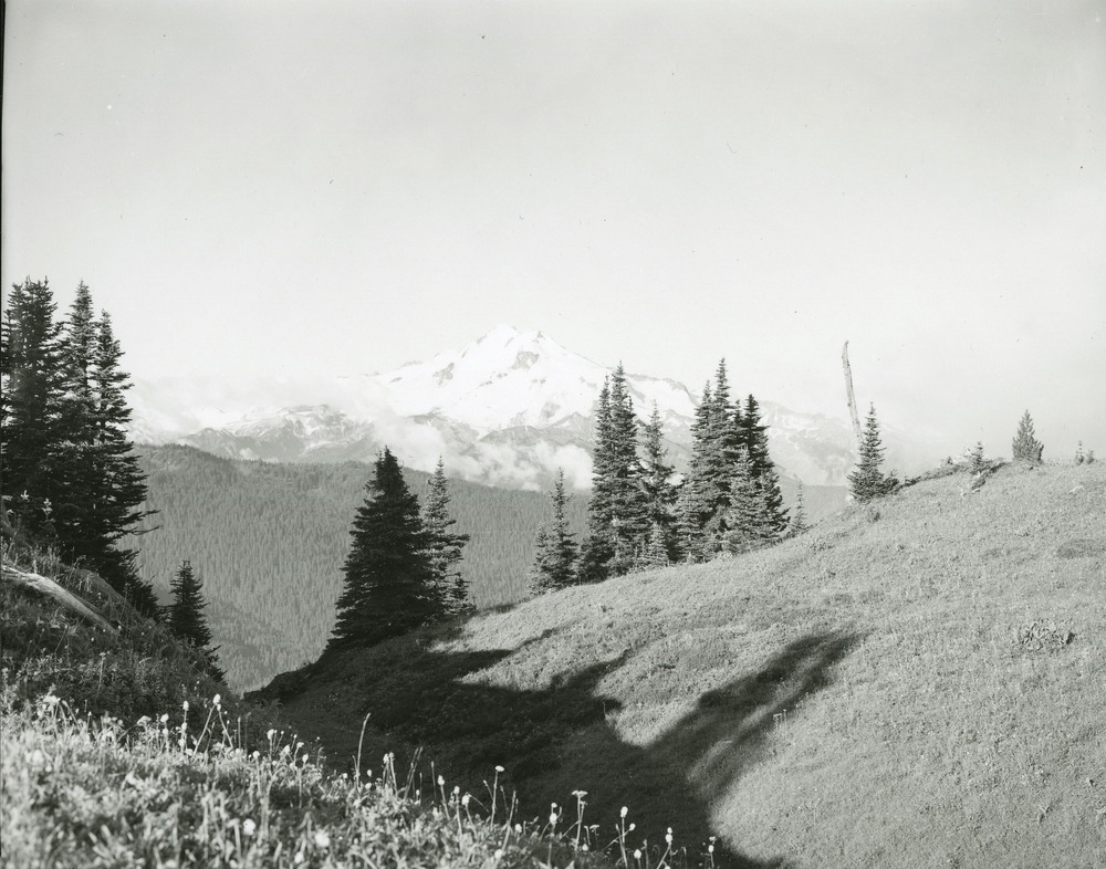 Glacier from crest of Miners Ridge above Suiattle Pass, showing meadow vegetation in foreground. (North Cascades NPS Complex Museum Collection, NOCA.0002 Assembled Collections, Series V: 1963 NPS North Cascades Survey Photographs, Subseries A: Prints and Negatives, File 333c)