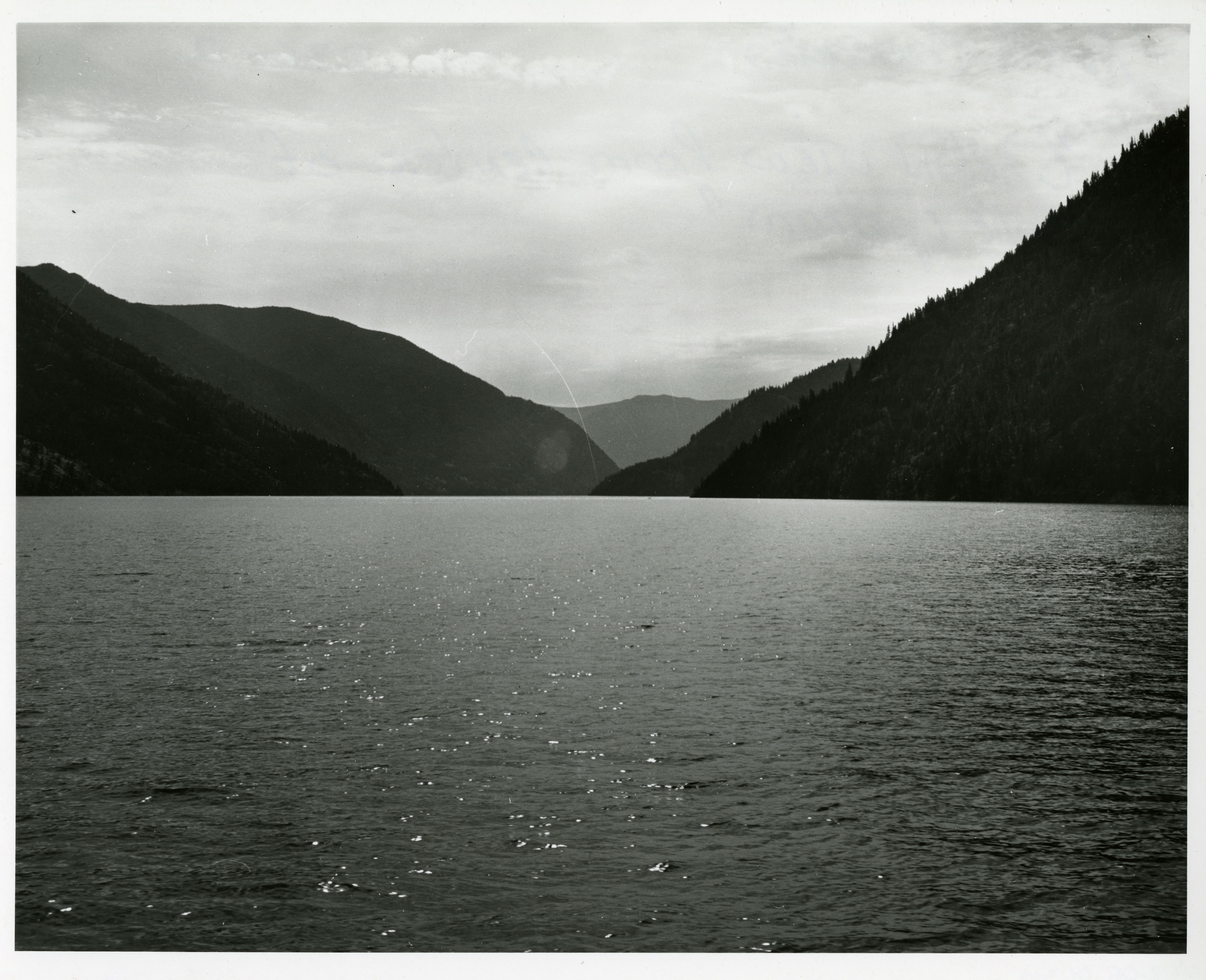 View of Ross Lake from center of lake. (North Cascades NPS Complex Museum Collection, NOCA.0002 Assembled Collections, Series V: 1963 NPS North Cascades Survey Photographs, Subseries A: Prints and Negatives, File 310)