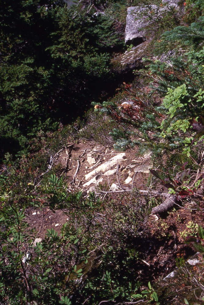 "Knob" west of Cascade Pass, revegetation monitoring photograph. Text on slide frame reads: "REV/CAS/KNO/d-1, TR 29 at 280 degrees, BS, O, 9/10/96." (North Cascades NPS Complex Museum Collection, NOCA.0013 Revegetation Program Records, Series XI: Photographs, File 001 - Cascade Pass, Vicinity Impacts and Revegetation Sites, 1970-2004)
