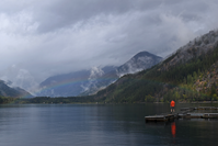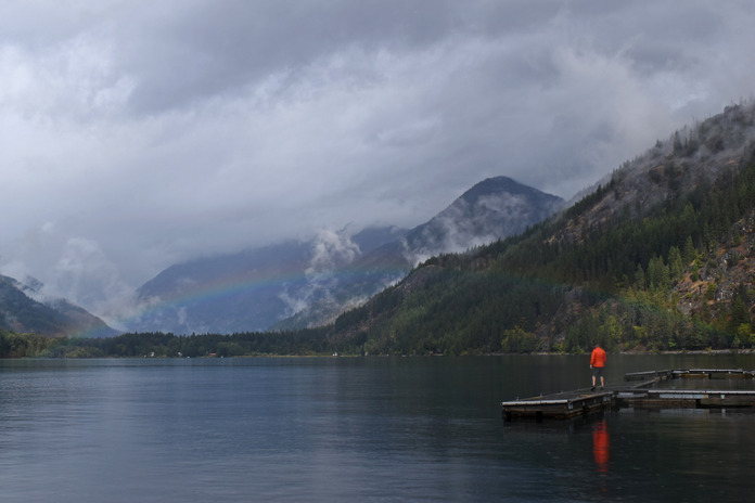 A man in an orange jacket stands on a dock looking at a rainbow in front of cloudy mountains.