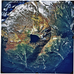 Color aerial photograph of glaciated mountain peak with alpine lake, forested valleys below.