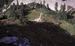 A landscape view down a slope of gentle grassy hills with shrubs, wildflowers, and trees. In the middle is a meadow with a rest area and trails leading away from it. At the bottom is a pit of stones which is cut through by a trail across a rocky mountain slope.