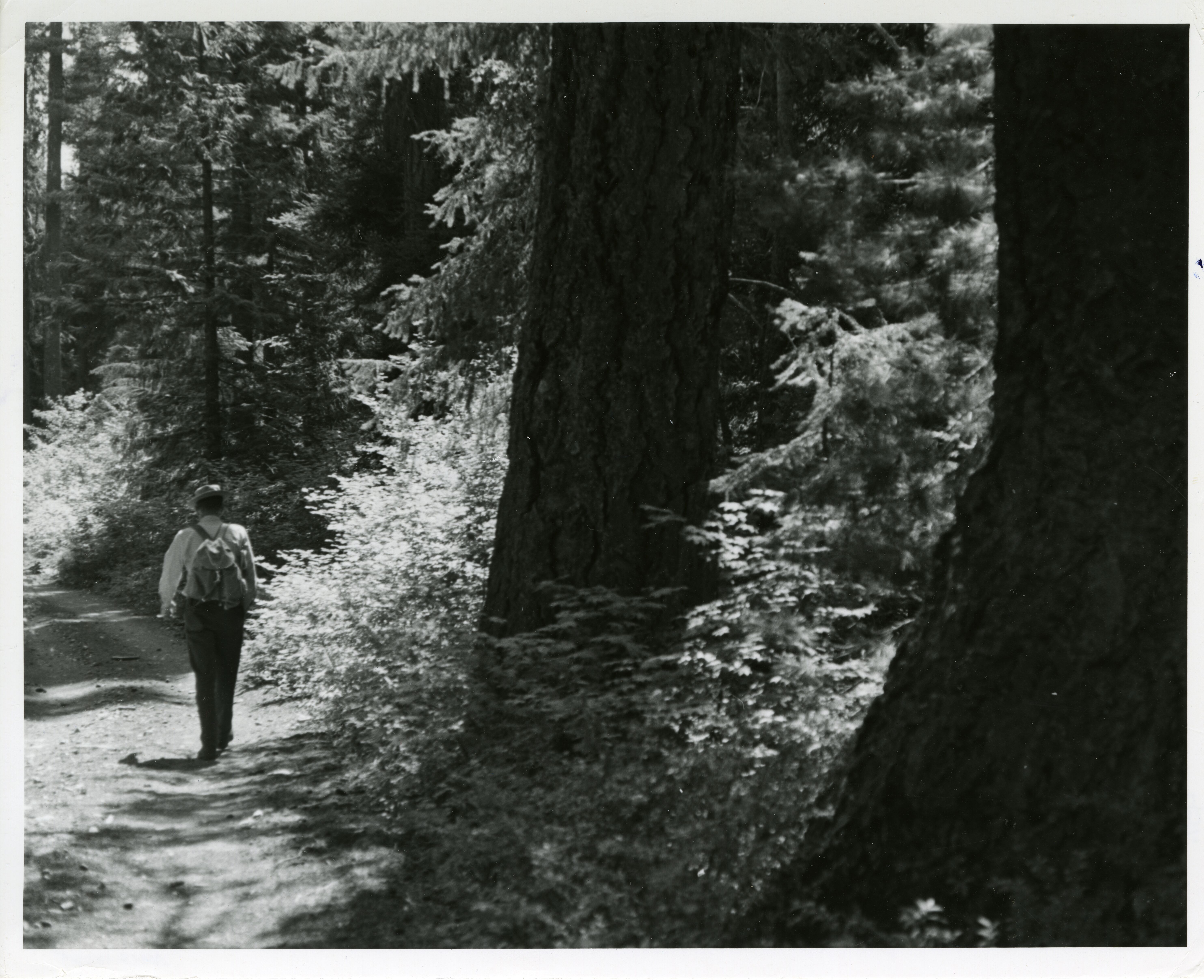 Man with hat and knapsack hiking on road through forest. (North Cascades NPS Complex Museum Collection, NOCA.0002 Assembled Collections, Series V: 1963 NPS North Cascades Survey Photographs, Subseries A: Prints and Negatives, File 142)