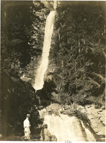 Photo 156 of an album of photographs taken by L.D. Lindsley of Mary Roberts Rinehart and party visiting the North Cascades in 1916. The catalog description reads: "Rainbow Falls. At its base, a man stands and a woman is seated, their backs to us." (North Cascades NPS Complex Museum Collection, Assembled Collections, Series II: Stehekin Area Photographs, File 001 - Mary Roberts Rinehart Album.)