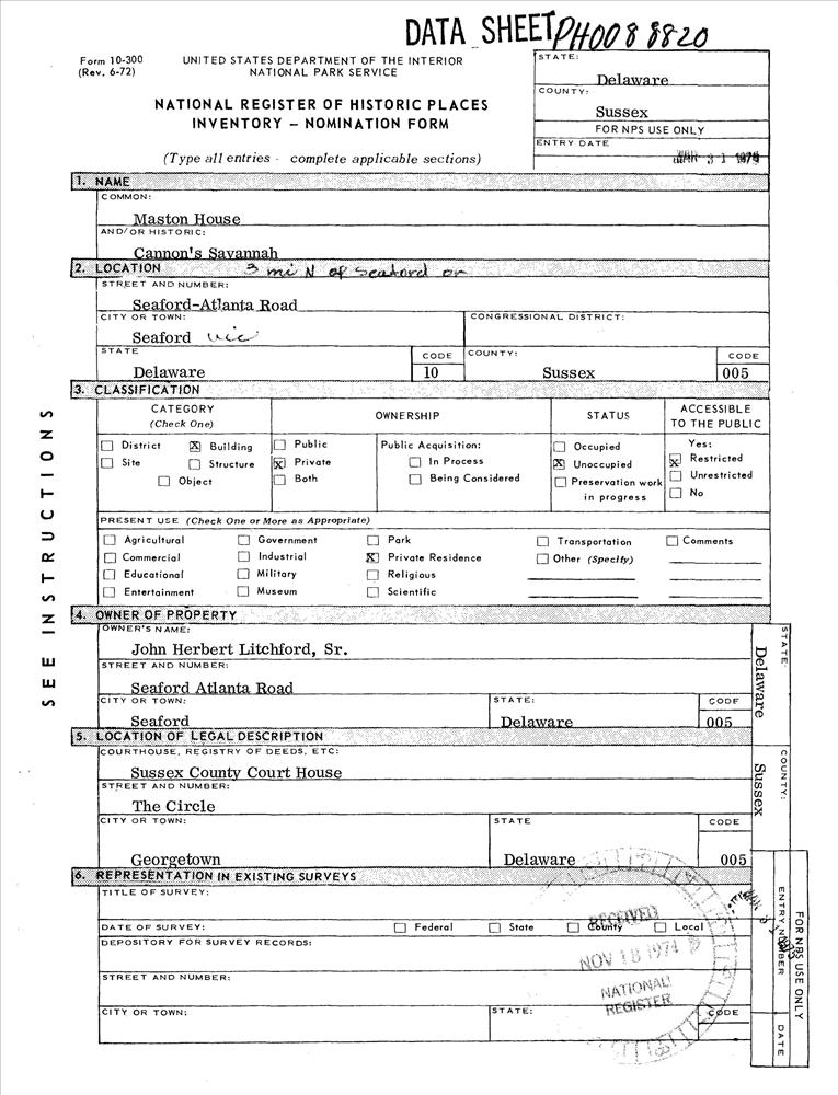 Seaford ; 3 mi. N of Seaford on Seaford-Atlanta Rd.