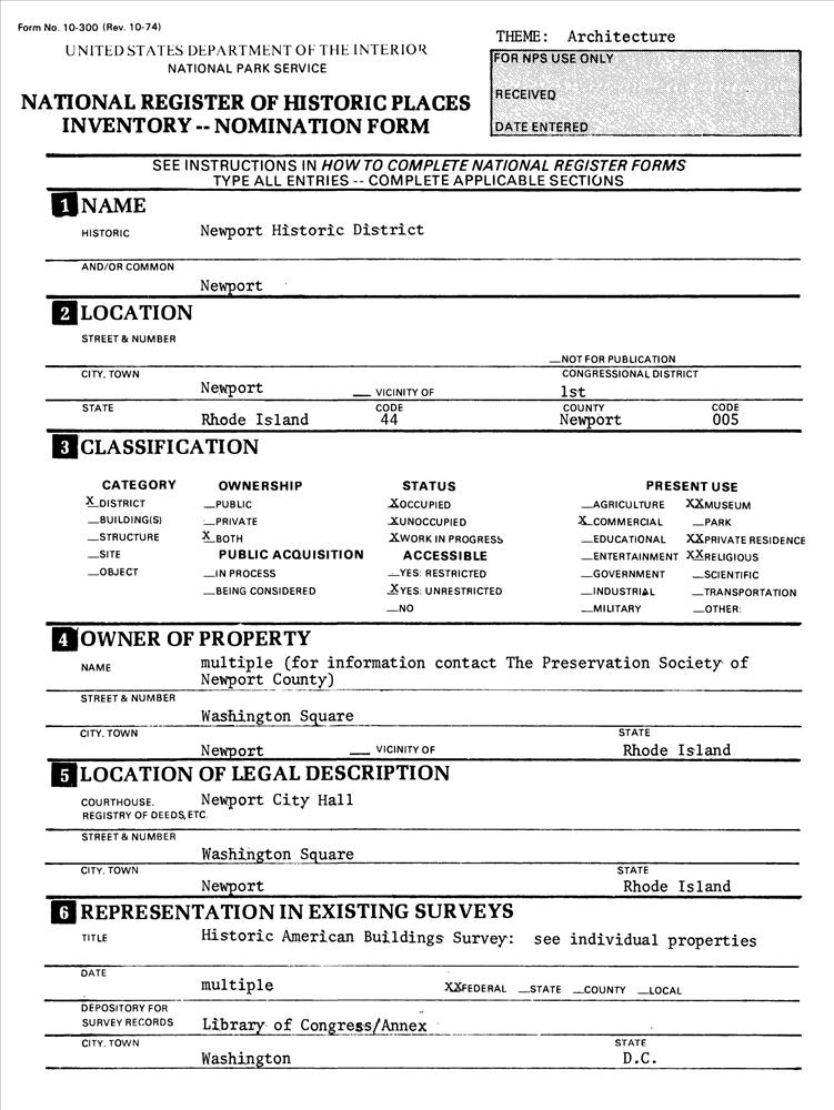 Newport ; Bounded roughly by Van Zandt Ave., Newport Harbor, Thames, Pope, William Sts., Bellevue Ave., Bull, Broadway, Kingston