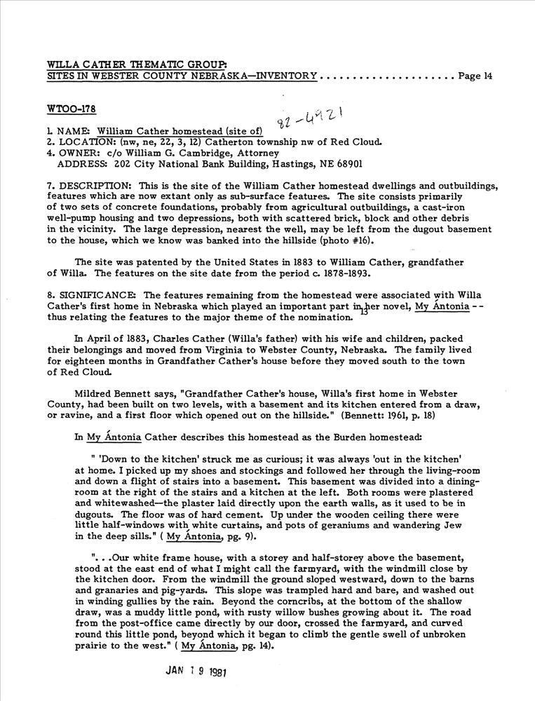 Cather, William, Homestead Site