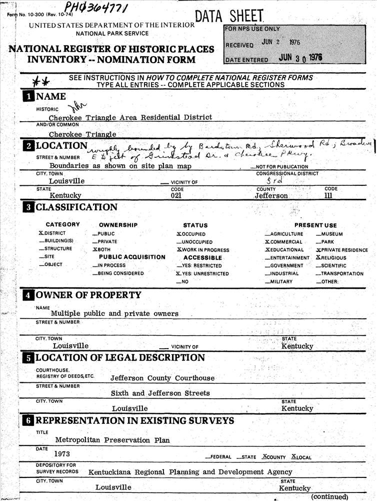 Louisville ; Roughly bounded by Bardstown Rd., Sherwood Rd., Broadway, E to jct. of Grinstead Dr. and Cherokee Pkwy.