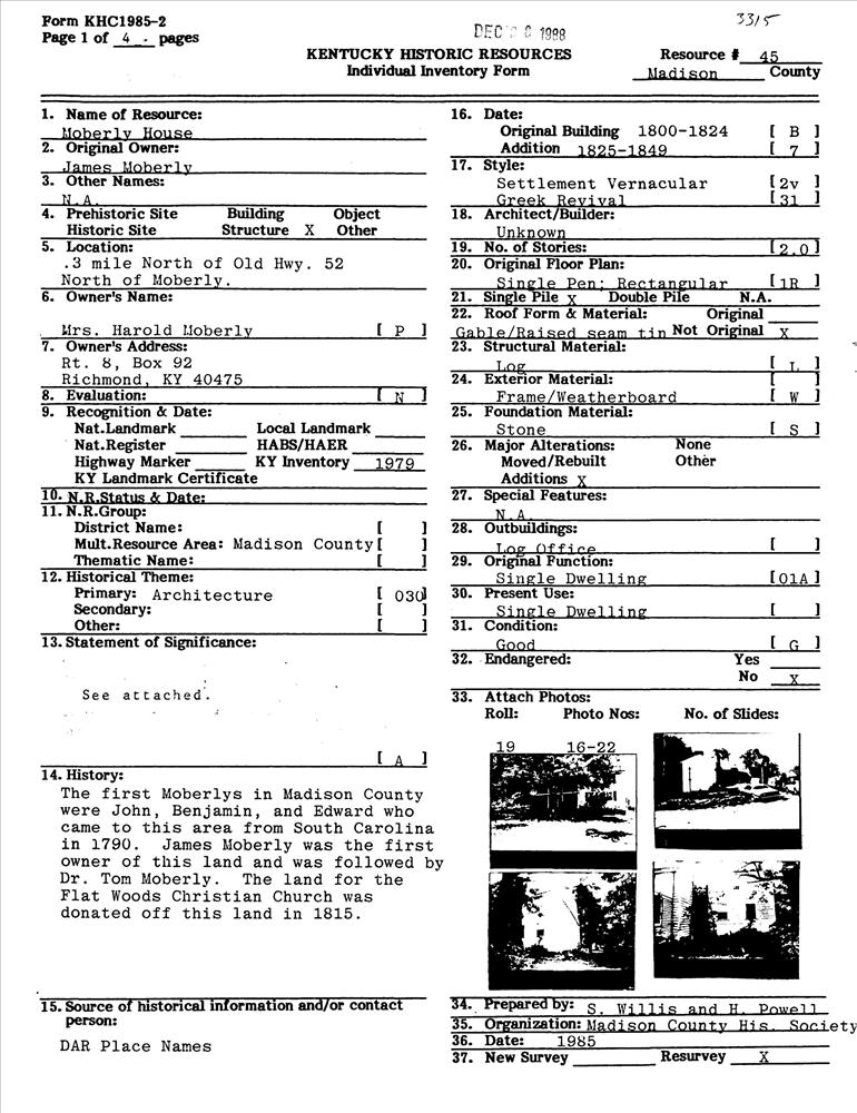 Moberly ; 0.3 mi. N of Old KY 52
