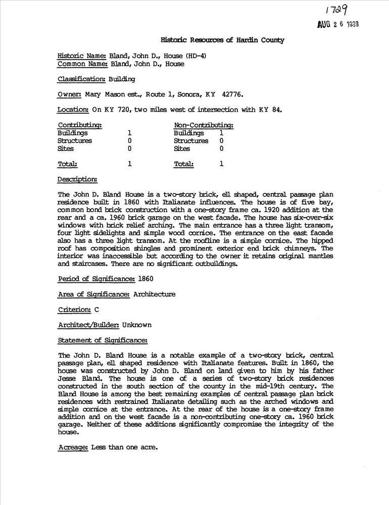 Sonora ; KY 720, 2 mi. W of jct. with KY 84