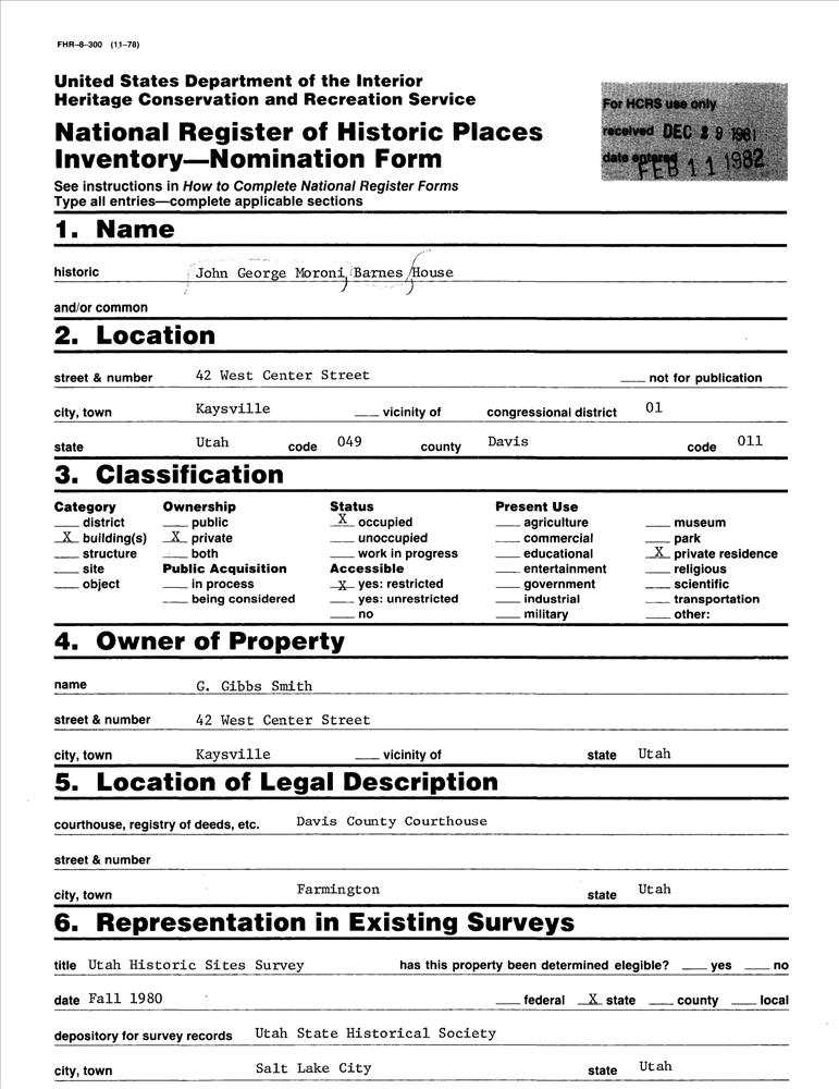 Barnes, John George Moroni, House