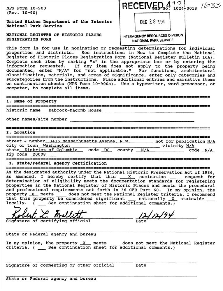 District of Columbia ; Washington ; 3415 Massachusetts Ave., NW.