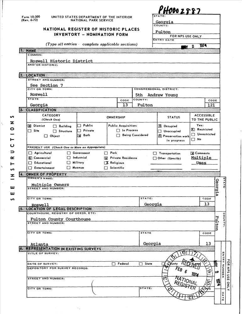 Roswell ; Roughly bounded by Big Creek, King and Dam Sts., SW along New Marietta Hwy.