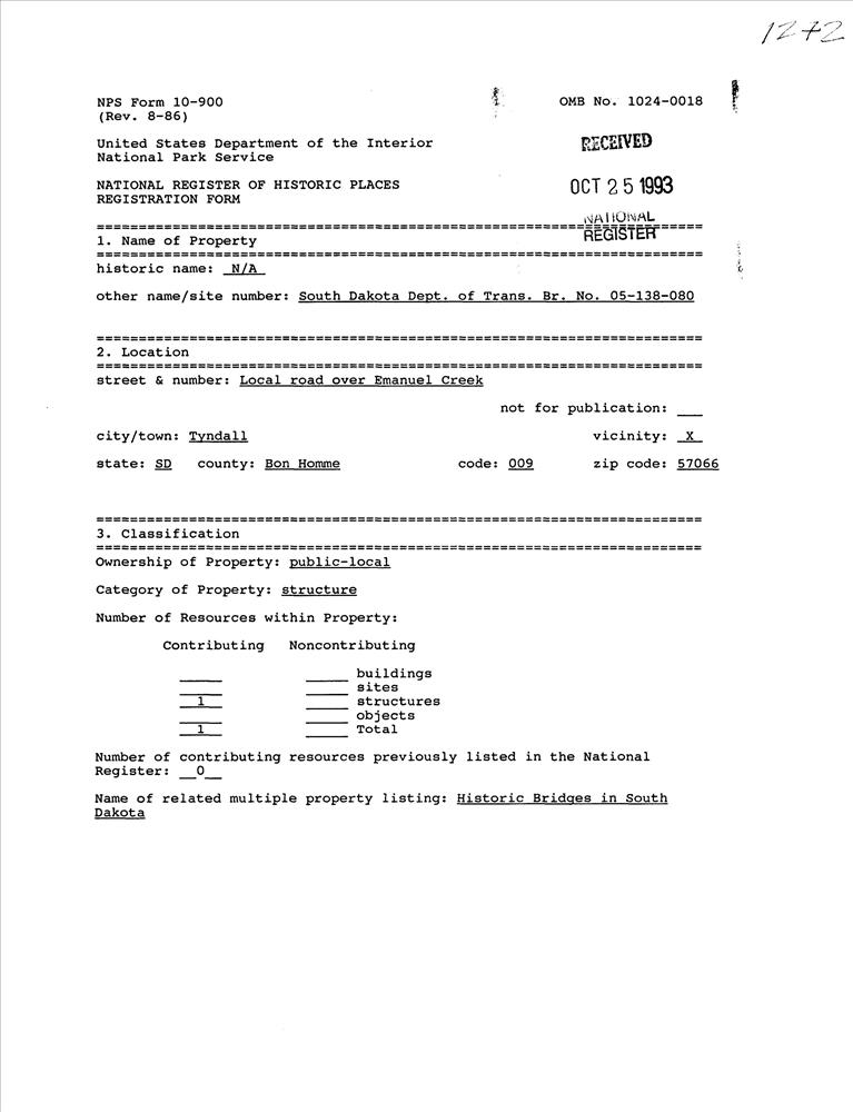 Tyndall ; Local rd. over Emanuel Cr.