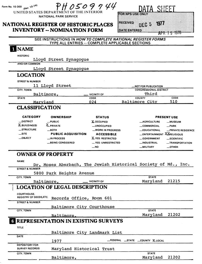 Baltimore (Independent City) ; 11 Lloyd St.