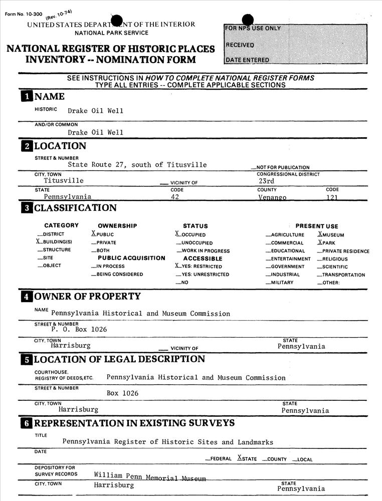 Titusville ; 3 mi. SE of Titusville on PA 36, in Drake Well Memorial Park