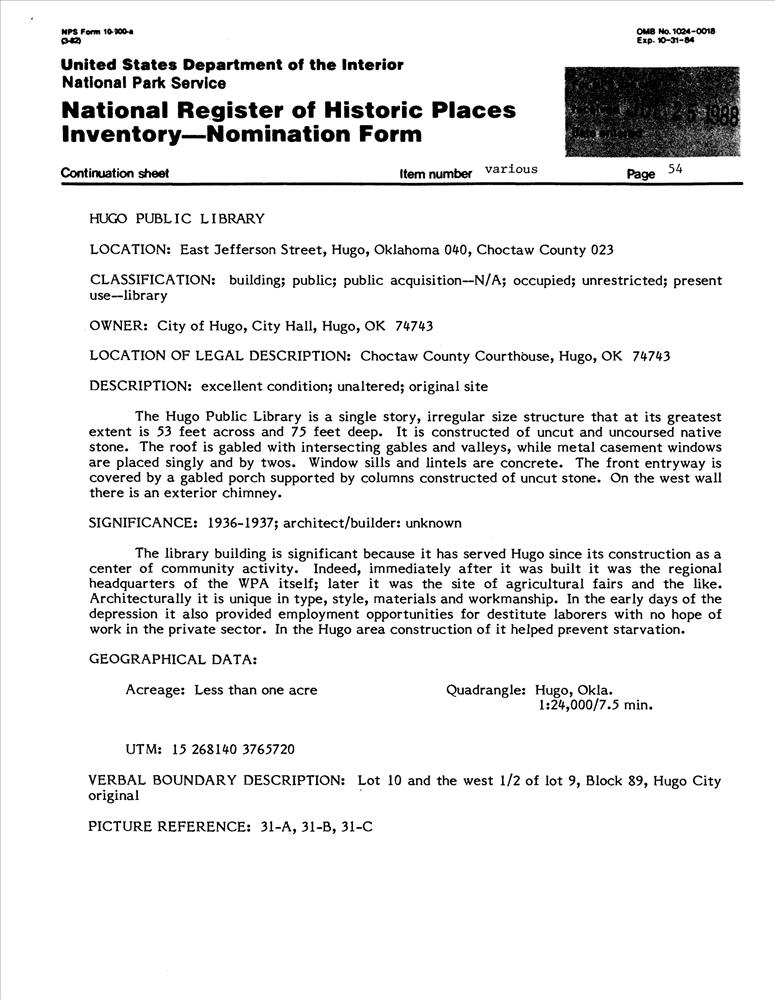 WPA Public Bldgs., Recreational Facilities and Cemetery Improvements in Southeastern Oklahoma, 1935--1943 TR