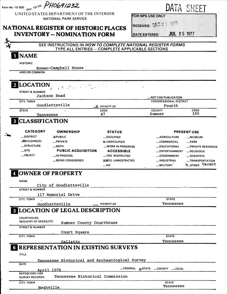 Goodlettsville ; E of Goodlettsville on Jackson Rd.