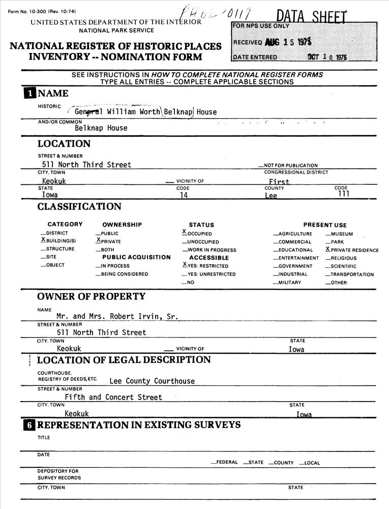 Belknap, Gen. William Worth, House