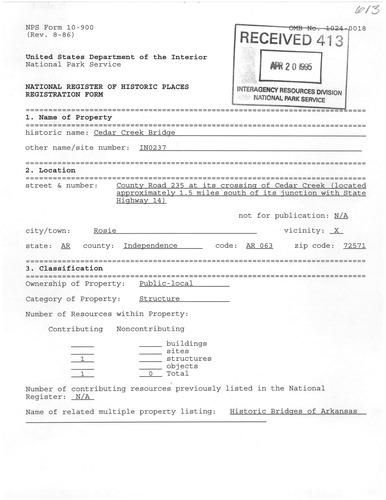 Co. Rd. 235 over Cedar Cr., approximately 1.5 mi. S of jct. of Co. Rd. 235 and AR 14