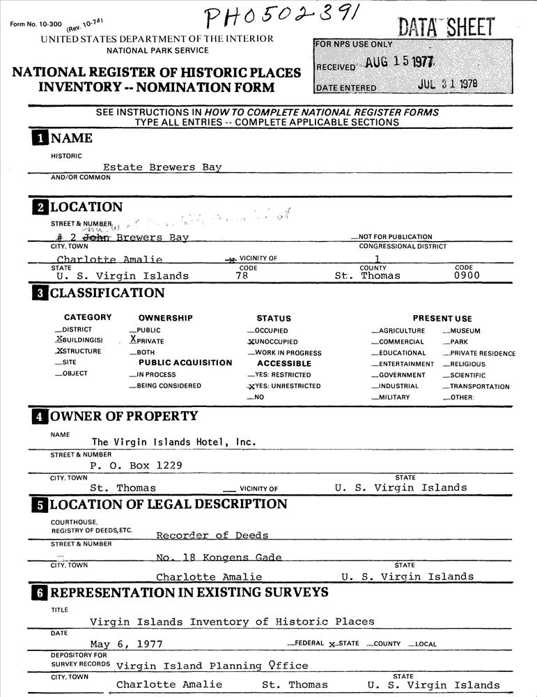 Charlotte Amalie ; 2 mi. (3.2 km) W of Charlotte Amalie at Brewers Bay