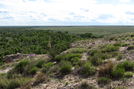 A view from a rocky outcrop overlooking a vast plain with scattered trees and wildflowers under a partly cloudy sky.