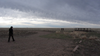 A man walking on a dirt road under a cloudy sky.